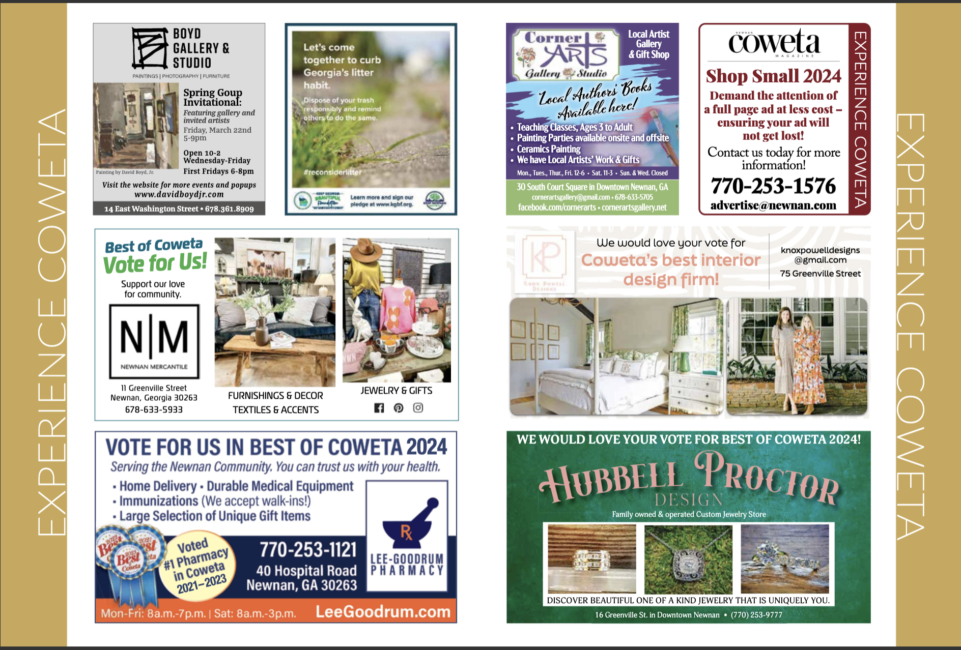 From cover to cover, Newnan-Coweta Magazine highlights the traditions, trends, celebrations and, most importantly, the people who make Coweta County a unique community. Our goal is to capture the vibrancy of life in Coweta County. NCM features local homes, gardens, history, seasonal features, the arts, entertainment scene, recreation, leisure pursuits, local getaways and more.